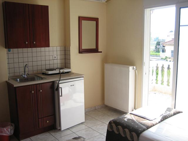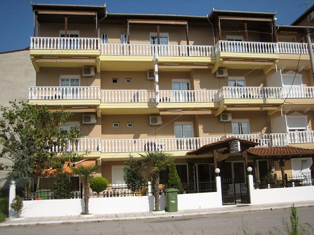 Paralia központjától kb. 500 méterre, a homokos tengerparttól kb. 160 méterre épült apartmanház