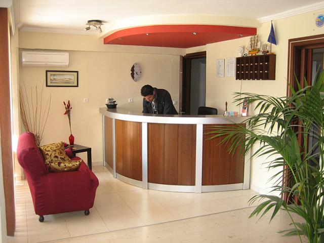 Recepció, társalgó TV-vel, lift, kis közös terasz az apartmanáz bejárata előtt.